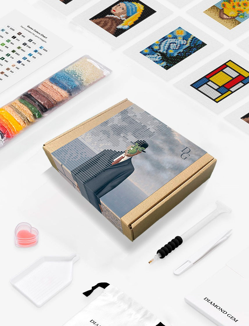 Nuestro set incluye 10 diseños de obras en diamantes importantes a lo largo de la historia, 30 colores de diamantes, 8640 diamantes para tus obras, un set de lienzo, bandeja, gemas, cera, aplicador, pinzas, colocadores y guía.