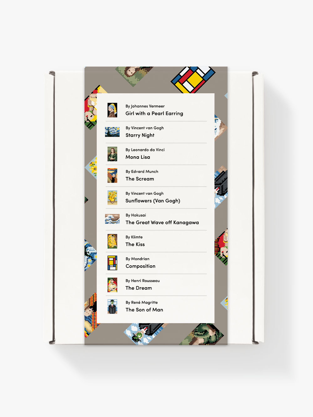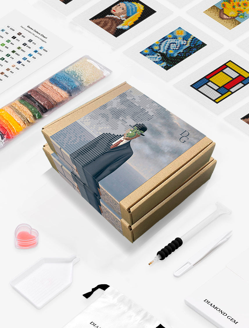 Nuestro set incluye 10 diseños de obras en diamantes importantes a lo largo de la historia, 30 colores de diamantes, 8640 diamantes para tus obras, un set de lienzo, bandeja, gemas, cera, aplicador, pinzas, colocadores y guía.